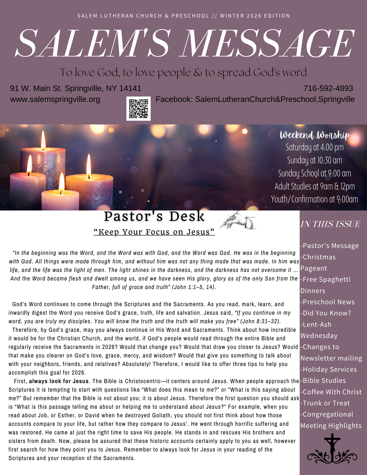 Welcome to Salem Lutheran Church and Preschool, a warm and inviting congregation nestled in Springville, NY. Join us in worship as we gather to glorify our Lord and Savior.